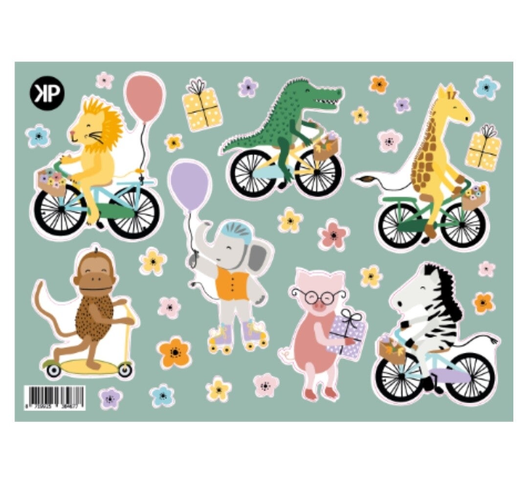 Dit stickervel heeft 7 verschillende Party Animals en vele bloemen en cadeautjes.