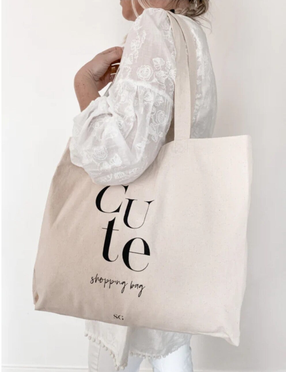 Hoe tof is deze mooie shopper van Stationery & Gift met de tekst: Cute Shopping Bag. Het logo SG staat op de voorkant en op de achterkant.