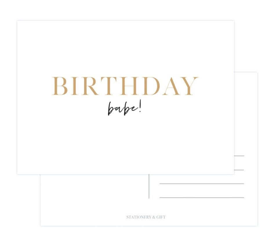 Op de voorzijde staat de tekst Birthday Babe. Op de achterzijde is er ruimte voor een persoonlijke tekst.