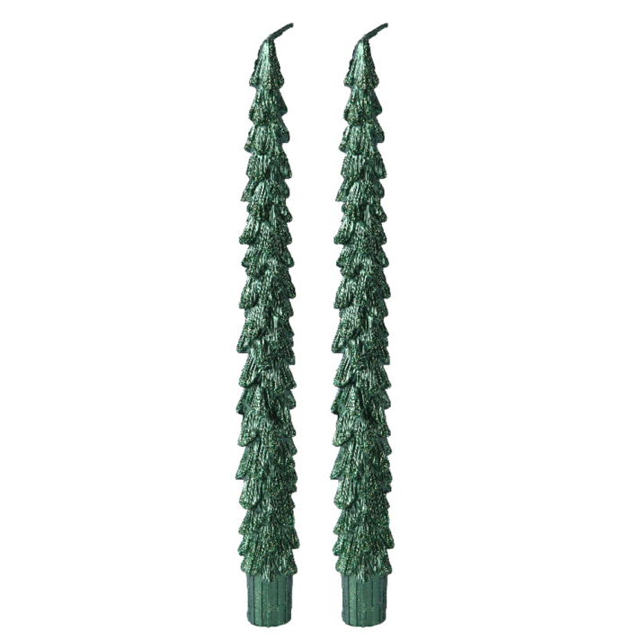 Prachtige set met 2 Glitter Wax Diner Kaarsen in de vorm van dennenbomen.