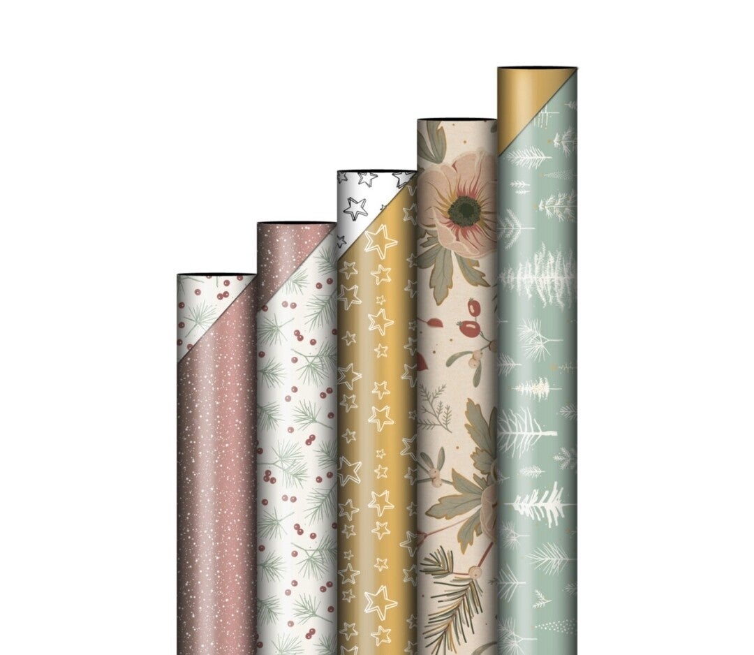 Cadeaupapier Set met 5 dubbelzijdige rollen die perfect bij elkaar passen.