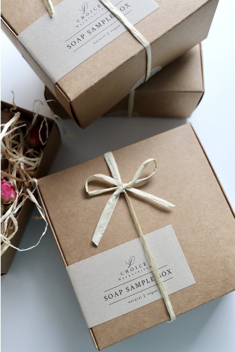 De mini zepen worden geleverd in een kraft doos gevuld met natuurlijk houtwol en bestrooid met rozenblaadjes.