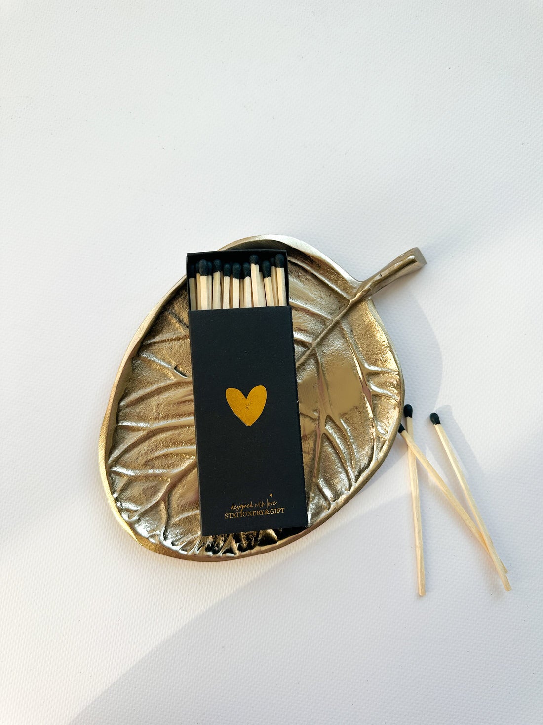 Het hartje is van een mooie goudfolie en in het doosje zitten lange lucfers met een zwartr steker.