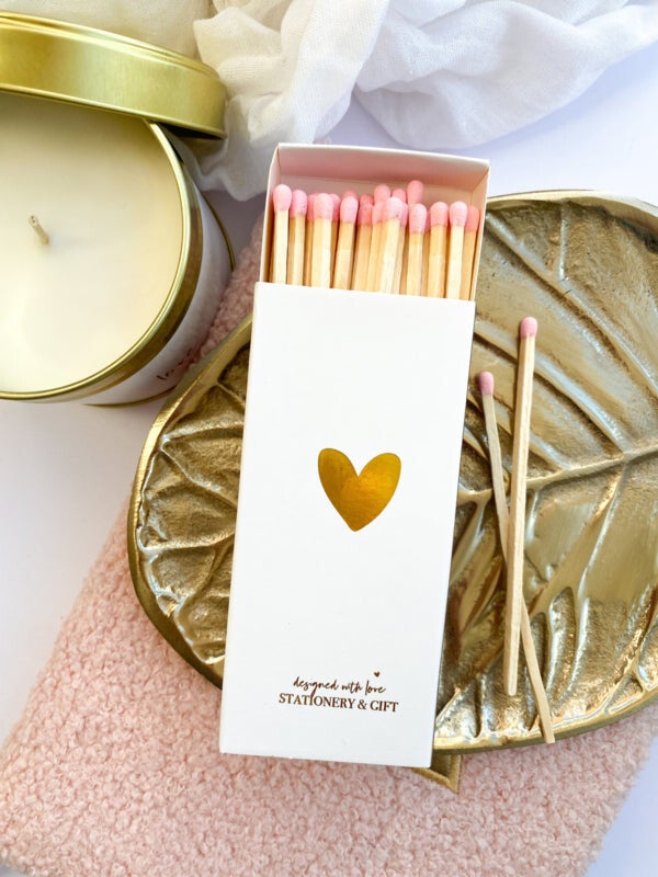 De tekst & hartje zijn van een mooie goudfolie en in het doosje zitten lange lucfers met ( ofcourse ) een roze steker.