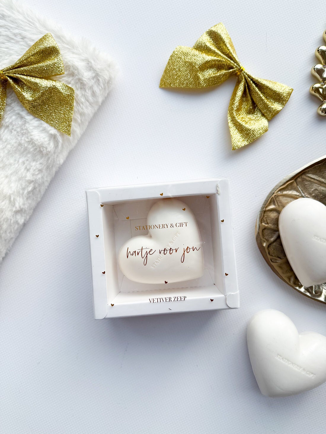Hartvormige zeep vol met liefde met de allerfijnste geur; Vetiver. Hoe leuk om cadeau te geven! De zeep zit in een mooi doosje met lieve gouden hartjes.