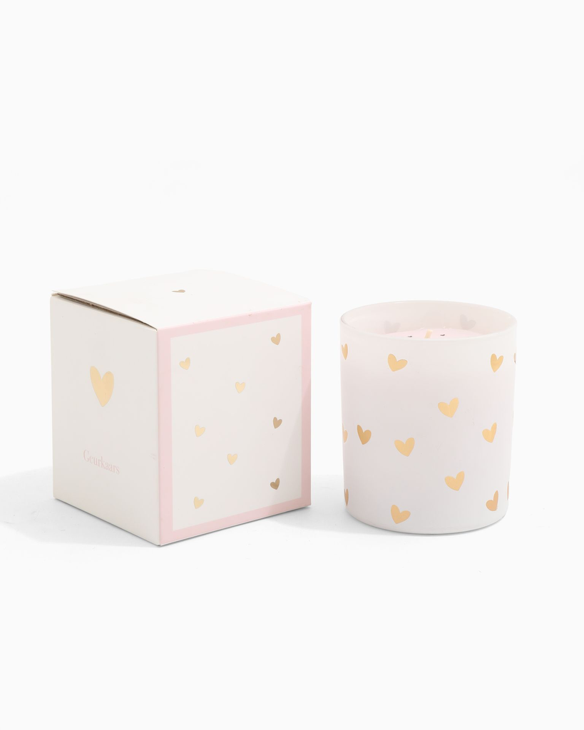 De geurkaars zit in een mooi wit glas voorzien van goudfolie gedrukte kleine hartjes. Nadat de geurkaars op is kun je het glas opnieuw gebruiken.