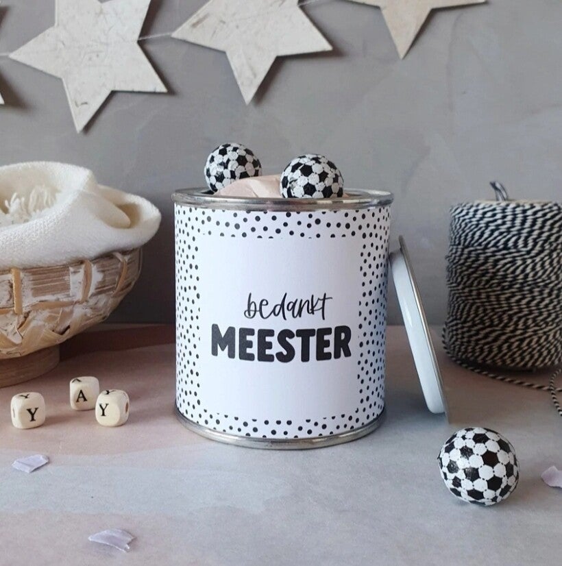Een super leuk blikje met een wikkel om cadeau te geven aan de meester.