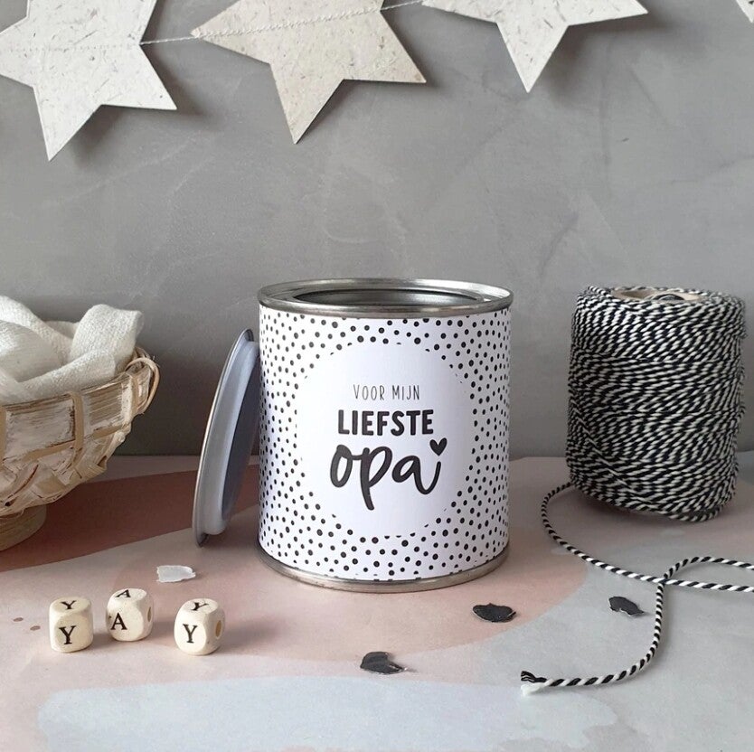 Een super leuk blikje met een wikkel om cadeau te geven aan opa.