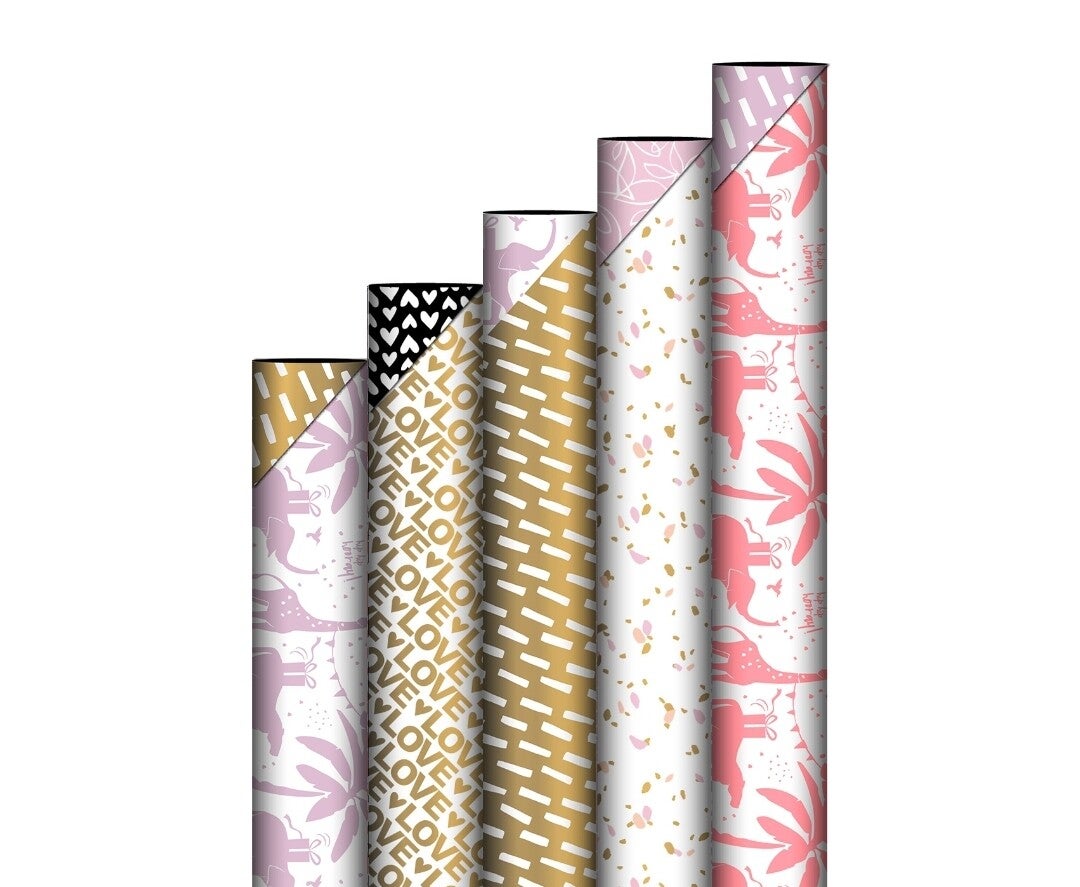 Cadeaupapier Set met 5 dubbelzijdige rollen die perfect bij elkaar passen.