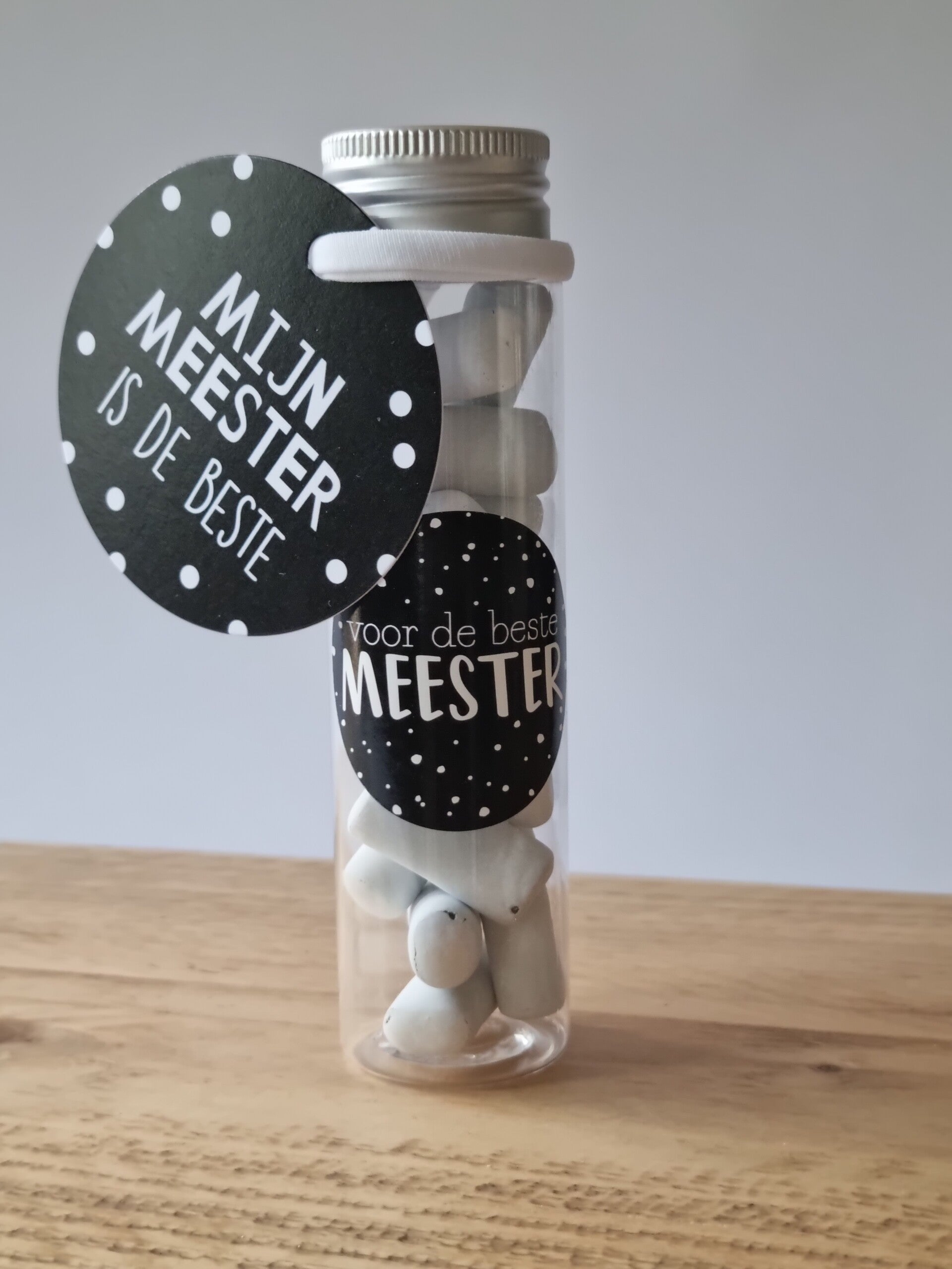 Een super leuke tube gevuld met snoep schoolkrijtjes.