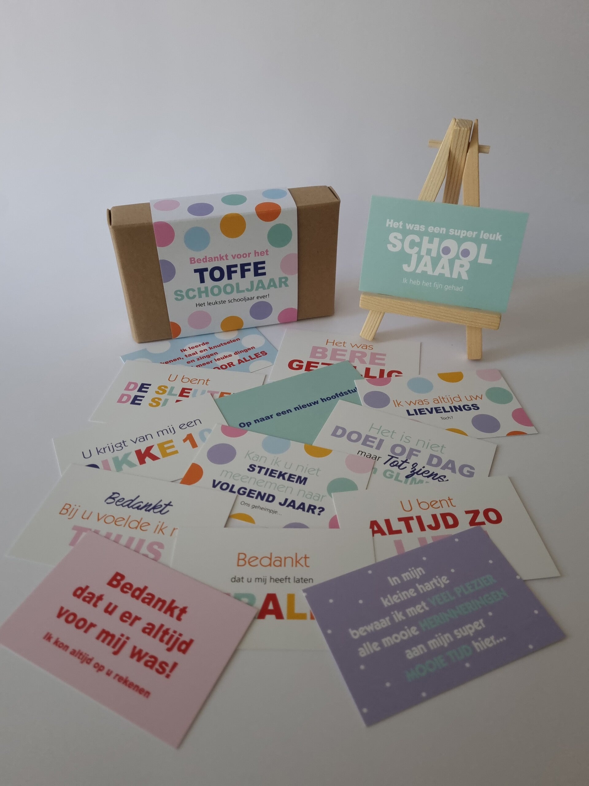 Doosje met een glimlach... de naam verraadt de inhoud al... hier krijgt u een glimlach van op uw gezicht. Of beter gezegd; de juf of meester! Een leuk formaat kraft doosje met hierin 14 enkele mini kaartjes (85x55mm) met uitspraken om de juf / meester te bedanken voor het leuke schooljaar. Deze doosje zijn super leuk om te geven maar nog leuker om te krijgen! De achterzijde van de kaartjes zijn geschikt om iets op te schrijven.