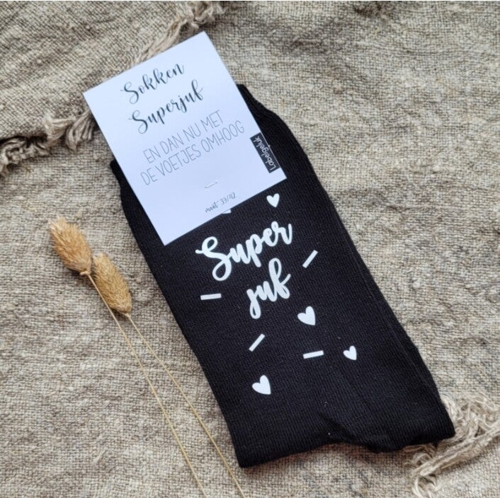 Verras de juf met deze mooie sokken met de tekst 'SuperJuf'.