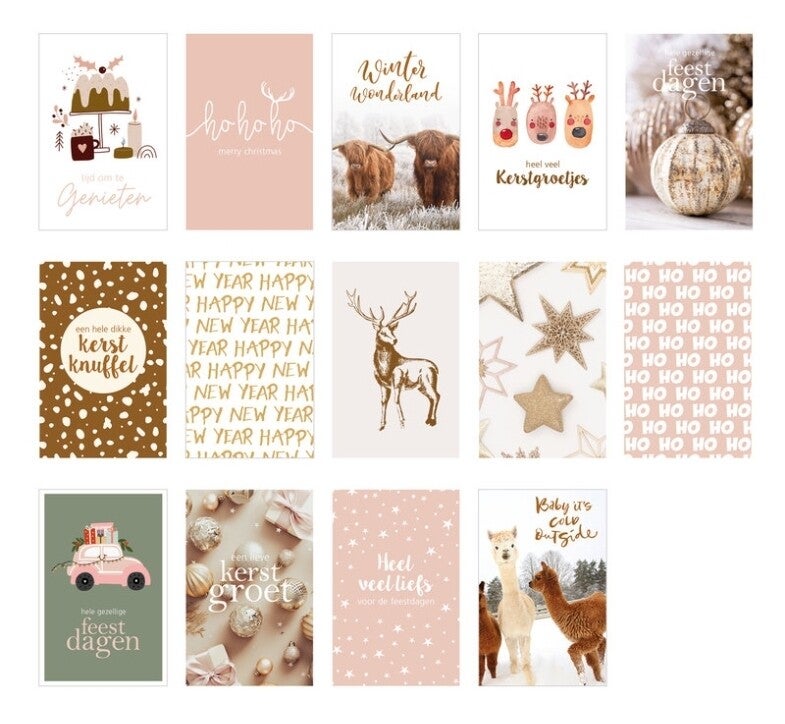Kerst doosje met een glimlach... de naam verraadt de inhoud al... hier krijgt u een glimlach van op uw gezicht. Een leuk formaat kraft doosje met hierin 14 enkele mini kaartjes (85x55mm) met uitspraken waar iedereen wel vrolijk van wordt. Om het doosje zit een leuke sleeve welke u kunt blijven gebruiken, doordat u deze er makkelijk af kunt schuiven. Deze doosje zijn super leuk om te geven maar nog leuker om te krijgen! De achterzijde van de kaartjes zijn geschikt om iets op te schrijven.