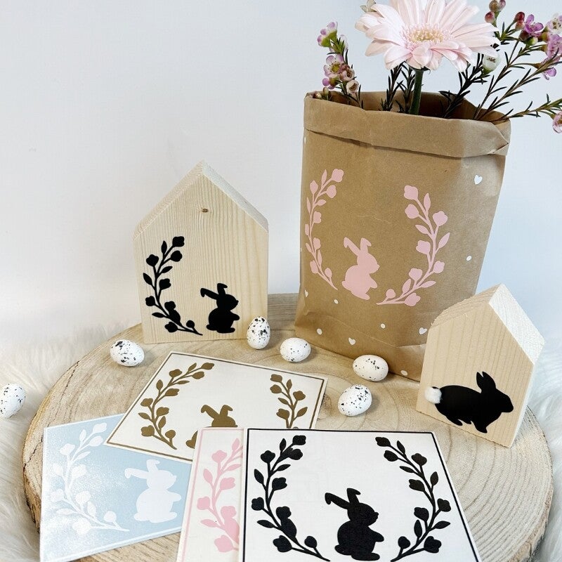 Met dit DIY setje, Konijn met krans, kun je een oude glazen pot, een vaas, een paperbag of een bakje leuk pimpen.